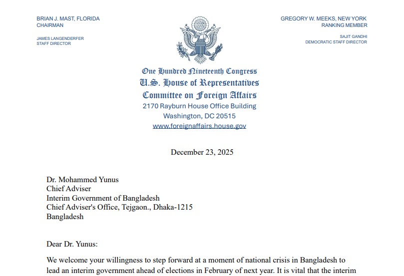 Senior members of the US House Foreign Affairs Committee sent the bipartisan letter to Chief Adviser Dr. Muhammad Yunus  expressing  concern amid the crisis in Bangladesh ,on December 23,2025.
